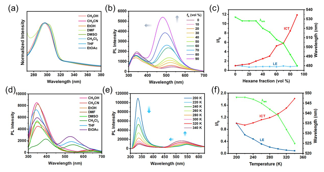 圖3.(a)P5-2CN在不同溶劑中的紫外可見吸收光譜;(b)P5-2CN在THF/正己烷溶劑中的PL光譜隨正己烷含量(fh)變化情況;(c)相對PL強度與fh的關系圖(I/I0,I0表示THF中的強度);(d)P5-2CN在不同溶劑中的PL光譜;(e)P5-2CN在THF中的溫度相關PL光譜;(f)相對PL強度和長波區發射波長隨溫度變化的關系圖(I/I0,I0表示200 K下的強度)。λex = 296 nm;濃度為10?5 M
