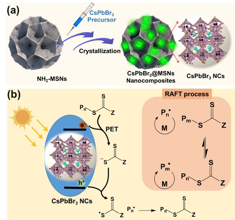 Scheme 1. (a) Schematic Illustration of the In Situ Formation and Crystallization Strategy of the CsPbBr3@MSNs Nanocomposites. (b) Proposed Mechanism for CsPbBr3@MSNs Nanocomposite Catalyzed PET-RAFT Polymerizations