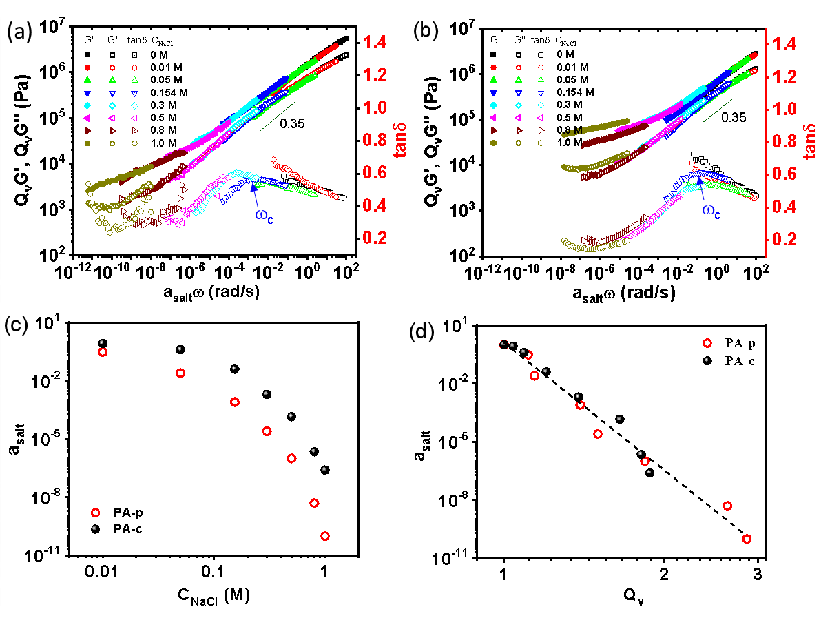 圖 4. 通過時間-鹽疊加原則構建的動態機械行為的master curve曲線以及相應的平移因子asalt。