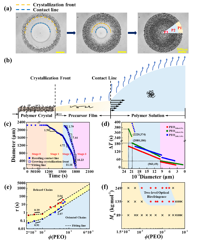 圖4.(a)PEO249k-0.5%薄膜在整個揮發和結晶過程中的結構演變及(b)其示意圖。(c)液滴直徑和結晶生長前沿隨時間變化關系。(d)接觸線后退和結晶生長前沿之間的時間滯后關系。(e)PEO249k溶液的松弛時間隨PEO溶液濃度變化關系。(f)二級光學雙折射對分子量和初始液滴濃度的依賴性。