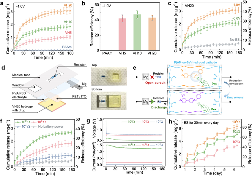 圖3 (a-c)外部電源驅(qū)動(dòng)的體外藥物釋放;(d-h)離子電滲透貼片的結(jié)構(gòu)和按需藥物釋放。