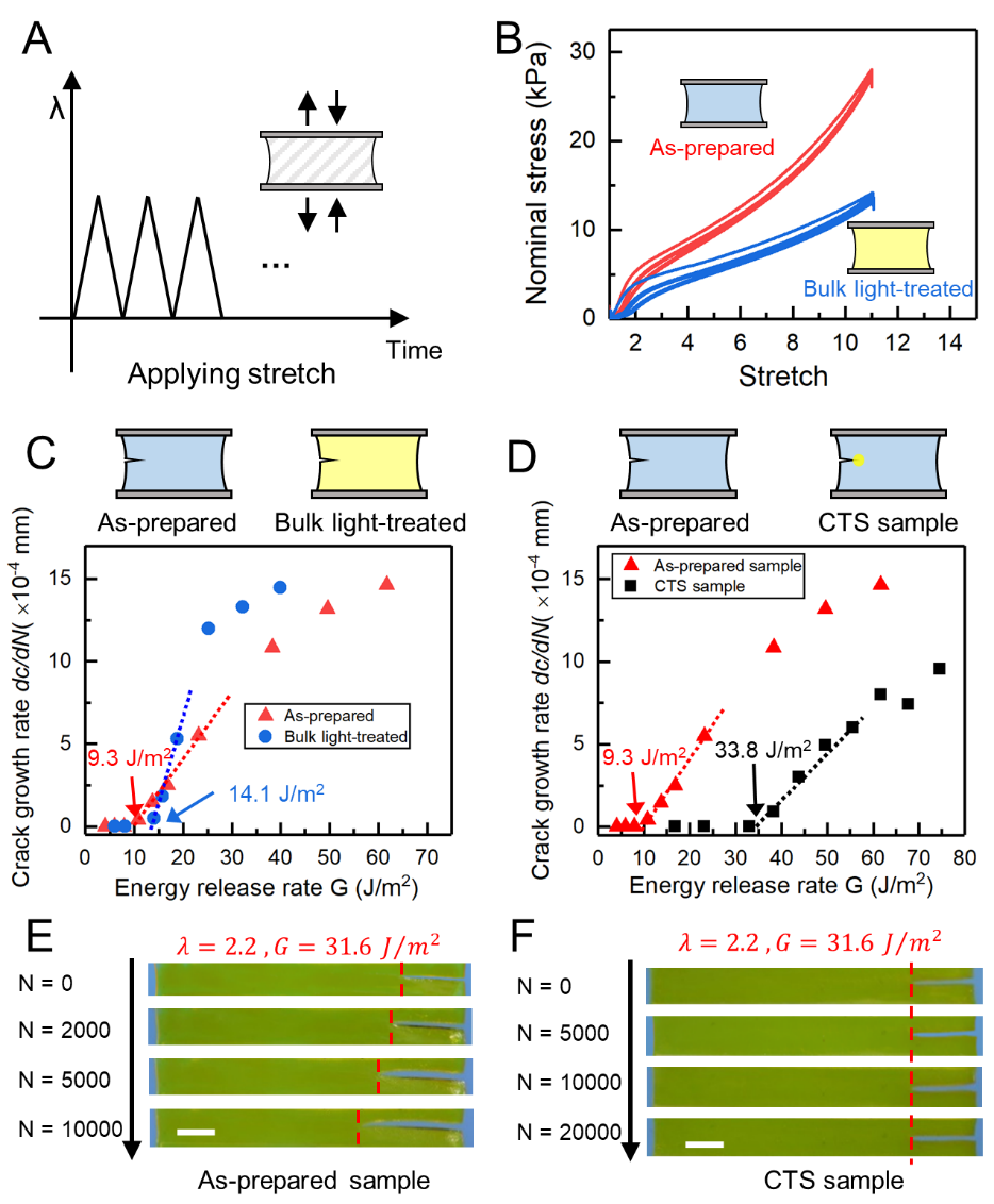 研究人員將CTS的提升效果歸功于緩解應(yīng)力集中和引入彈性屏蔽。在CTS試件中,裂紋尖端變軟變韌。軟的裂紋尖端在外載下鈍化,將應(yīng)力分散于大部分材料中;韌的裂紋尖端材料提高了裂紋擴(kuò)展阻力。即裂紋擴(kuò)展阻力與驅(qū)動力之間的壁壘增大。此外,軟化的裂紋尖端由于短鏈的破壞,聚合物網(wǎng)絡(luò)更趨近于完美,具有更好的彈性(圖5A)。在外力作用下,彈性材料不會發(fā)生疲勞。換句話說,軟化的裂尖區(qū)域在循環(huán)載荷下為體相材料提供了彈性屏蔽。當(dāng)循環(huán)載荷增加,長聚合物鏈充當(dāng)彈性耗散體,沿著整條鏈釋放能量,進(jìn)一步提高疲勞閾值。