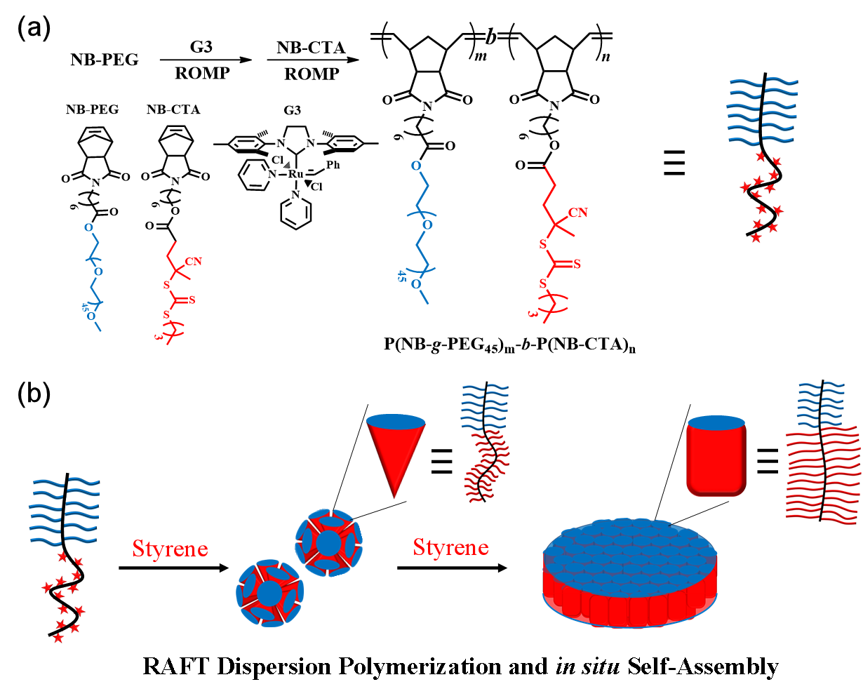 圖1. (a) P(NB-g-PEG45)m-b-P(NB-CTA)n大分子鏈轉(zhuǎn)移劑的合成, (b) PISA輔助grafting-from策略制備刷型嵌段聚合物及其PISA過程。
