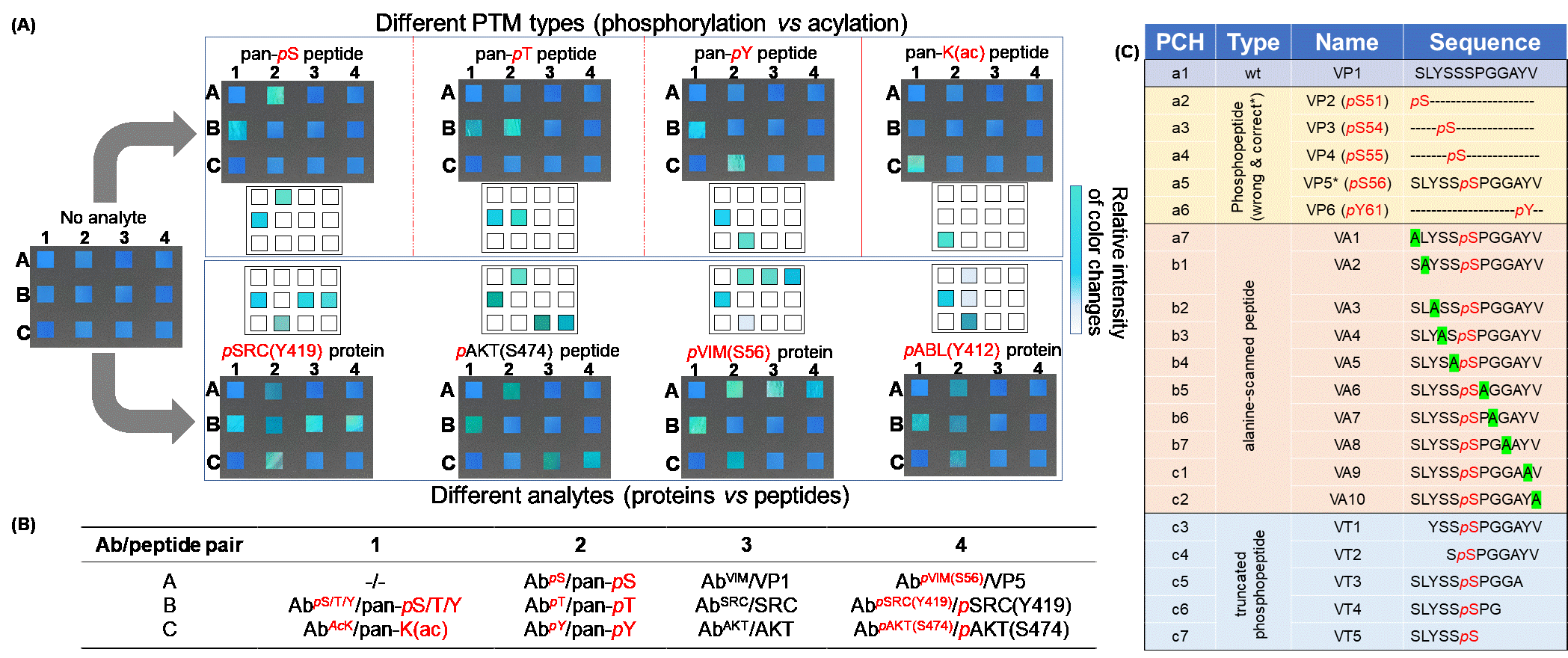 圖2. PCH傳感器芯片識別不同蛋白質/多肽的PTMs