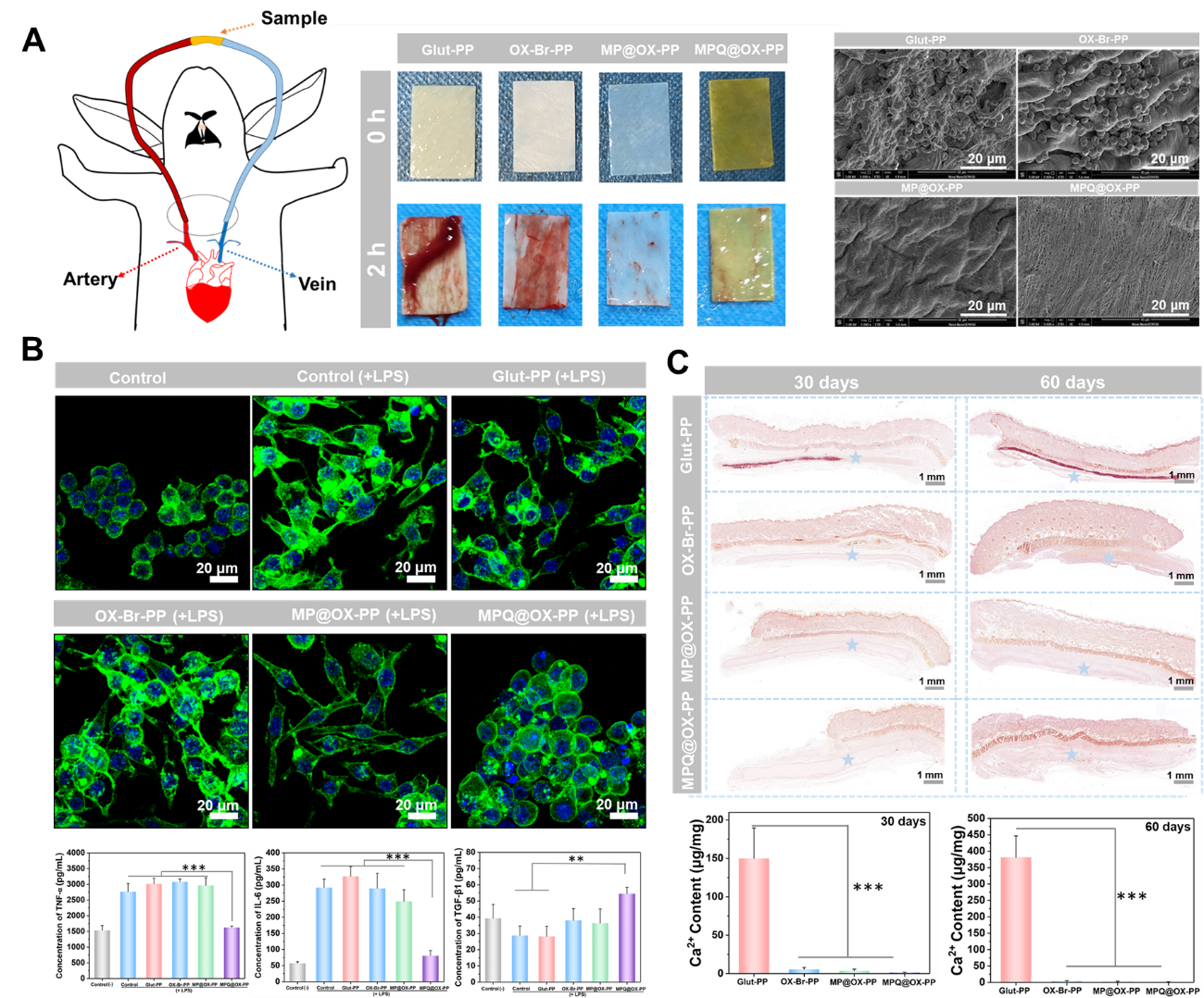圖2:(A)目標瓣膜材料在兔子動靜脈半體內血液循環實驗中的表現結果;(B)目標瓣膜材料在體外抗炎實驗中的實驗結果;(C)目標瓣膜材料在體內鈣化實驗中的表征結果。