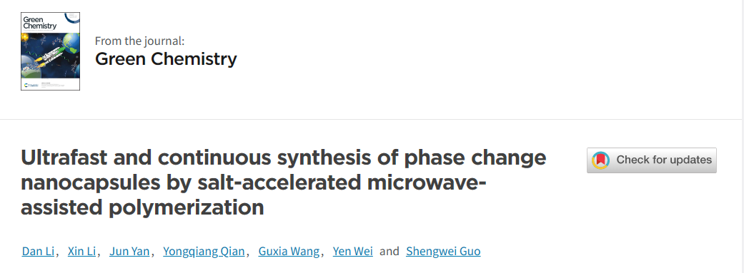 該工作以“Ultrafast and continuous synthesis of phase change nanocapsules by salt-accelerated microwave-assisted polymerization”為題發表在《Green Chemistry》上。該研究工作得到了國家自然科學基金、寧夏自然科學基金、寧夏重點研發計劃項目、北方民族大學研究生創新項目和中央高;究蒲袠I務費的支持。