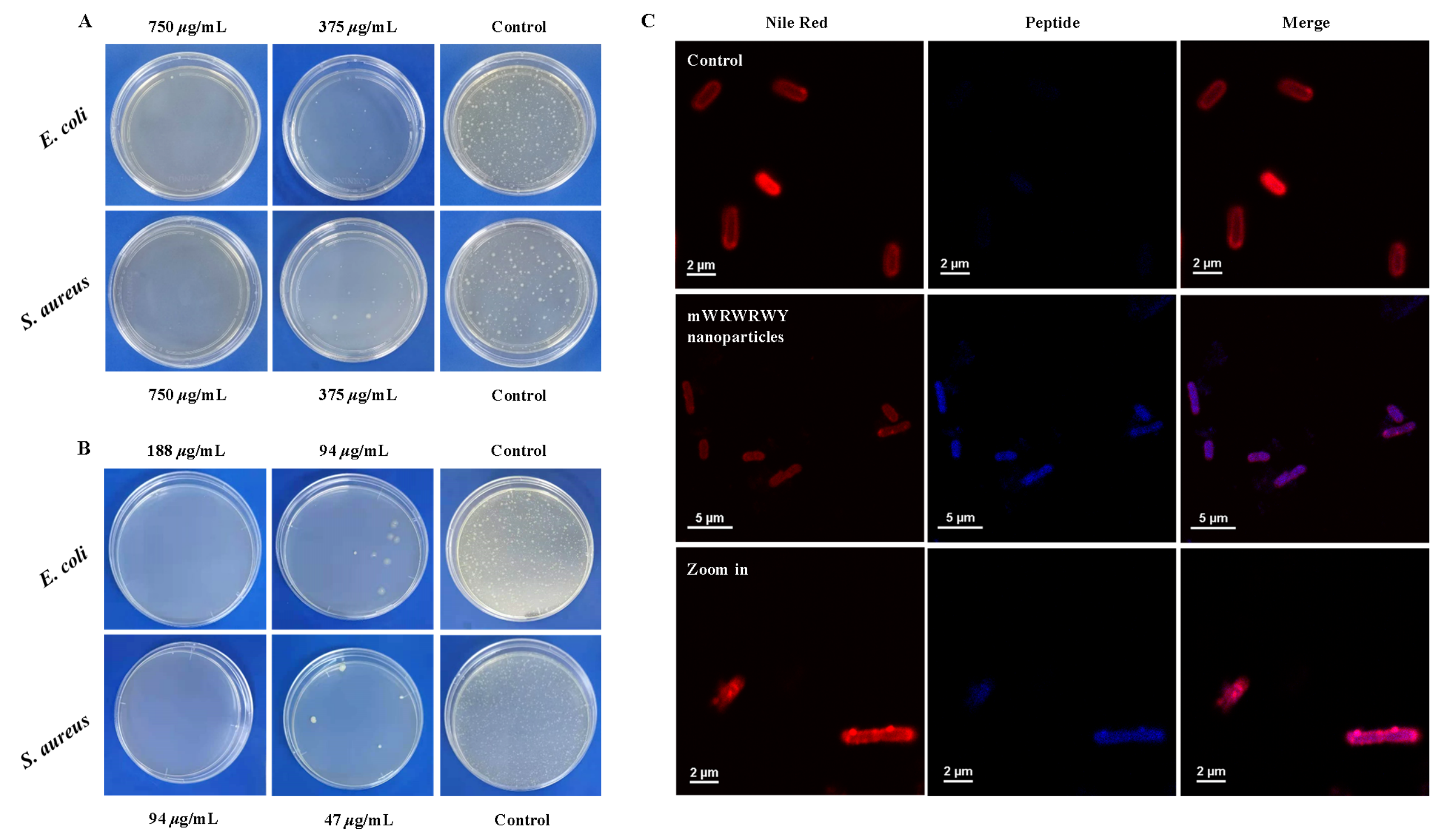 圖2. (A-B)多肽在氧化前和氧化后的最低抑菌濃度;(C)大腸桿菌與多肽納米顆粒共孵育后的激光掃描共聚焦顯微鏡圖。
