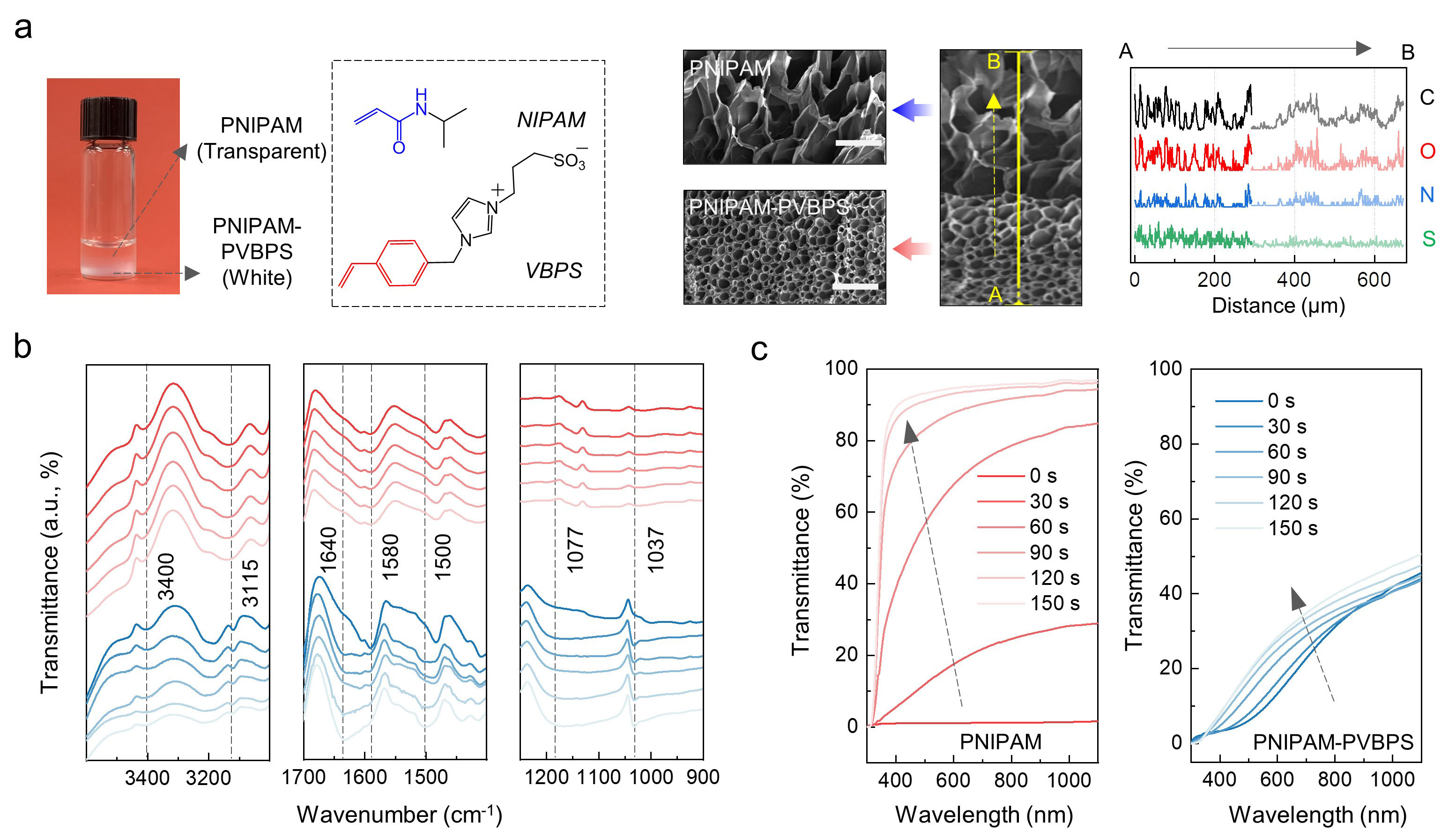 在通過一系列不同的單體進行預篩選后,作者確定了一類乙烯基單體和一類兩性離子苯乙烯基單體,用于通過聚合誘導的宏觀相分離機制制備雙層水凝膠(乙烯基和苯乙烯基單體都具有良好的水溶性)。聚乙烯基(例如 pNIPAM)鏈段具有典型的熱響應性,具有從親水性(<LCST)到疏水性(LCST)的相轉變過程,而同時結構性聚苯乙烯基兩性離子網絡(pVBPS)表現出離子強度依賴性。經一鍋法制備得到的 pNIPAM-pVBPS 雙層水凝膠由 LCST 層(PNIPAM主導)和兩性離子層(PVBPS主導)組成,兩層之間具有無縫界面,并且通過控制自發的宏觀相分離在多長度尺度上可編程層厚度。