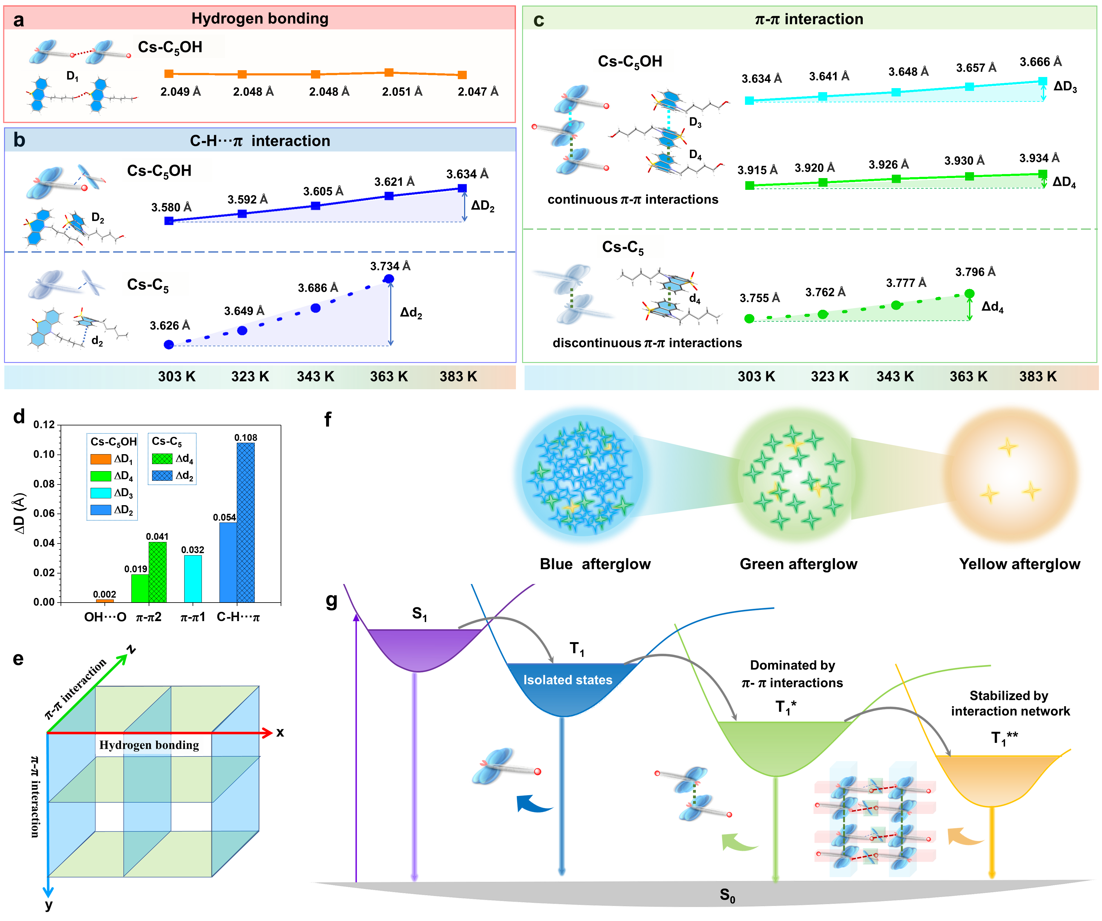 圖 2 磷光性能與分子間相互作用的關系。隨著溫度從303 K升高到383 K,(a) Cs-C5OH中氫鍵作用的變化;(b) Cs-C5OH和Cs-C5晶體中C-H···π距離的變化;(c)Cs-C5OH和Cs-C5晶體中π-π距離的變化;(d) 不同種類分子間相互作用距離的變化 (ΔD);(e) 由π-π相互作用和氫鍵作用構建的三網相互作用網絡;(f) 余輝顏色隨溫度升高而變化的示意圖。在初始狀態 (303K) 時,藍色、綠色和黃色的磷光發射同時存在,主要呈現藍色余輝。然后,Cs-C5OH的熱運動大大削弱了藍色的磷光,導致表現為具有更好的耐高溫性的綠色的余輝,并在更高溫度下變為黃色余輝;(g) 磷光顏色與分子間相互作用的關系,藍色磷光主要由C-H···π相互作用和氫鍵主導,綠色磷光主要由π-π相互作用和氫鍵主導,黃色磷光主要由相互作用網絡主導。