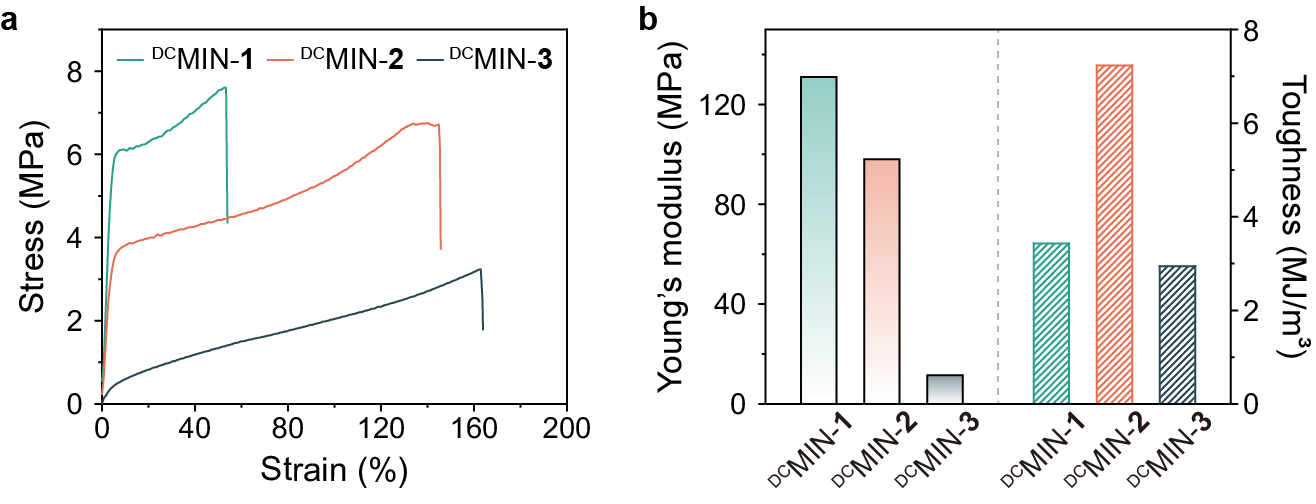 具體來說,自互補(bǔ)的AB型單體1溶于二氯甲烷中(300 mM),在B24C8和DAAS的作用下,自組裝形成超分子的[an]雛菊鏈(圖1a)。然后,利用商用的巰基功能化的PDMS作為交聯(lián)劑將預(yù)聚的[an]雛菊鏈交聯(lián)起來,形成機(jī)械互鎖的聚合物網(wǎng)絡(luò)(DCMINs)(圖1b)。為了確定最佳的投料比,作者制備了硫醇基團(tuán)和烯烴基團(tuán)的摩爾比為1/3,1/4和1/5的三種機(jī)械互鎖聚合網(wǎng)絡(luò),分別命名為DCMINs-1-3。