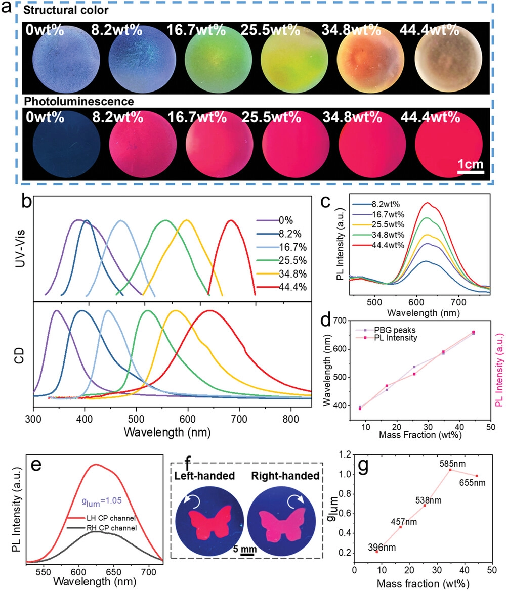近日,四川大學盧燦輝教授、熊銳特聘研究員和福建師范大學盧至行講師生物體(如甲蟲和螢火蟲)利用圓偏振光對復雜生物信息進行加密的啟發,報道了一種基于納米纖維素(CNC)和金納米團簇(bioAuNCs)手性光子結構的多通道手性光學生物標簽。CNC是一種天然可再生的棒狀納米材料,具有豐富表面基團、良好生物相容性、生物降解性、低成本等特性,能夠自組裝成具有左旋手性向列結構的彩色薄膜。bioAuNCs作為客體發光材料,通過一維核殼自組裝固定在CNC表面,然后共組裝成手性向列相納米結構。所得到的復合標簽攜帶五種光學信息,能夠實現相互獨立的多通道防偽加密。