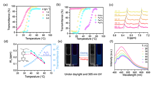 研究人員以AAm和VPhDT為單體,通過可逆加成-斷鏈轉移制備了一系列UCST型溫敏性AIE聚合物。研究了在水相中AAm-VPhDT共聚物的溶液行為和發光行為(圖2)。AAm均聚物表現為水溶性,而AAm與VPhDT之間的強氫鍵作用使材料在特定比例下呈現出高溫溶解、低溫不溶的上臨界溶解溫度行為(UCST)。這種溫度響應性的鏈聚集同樣影響了其發光行為:聚合物溶液在低溫下可以發出更明亮的藍色(圖2)。