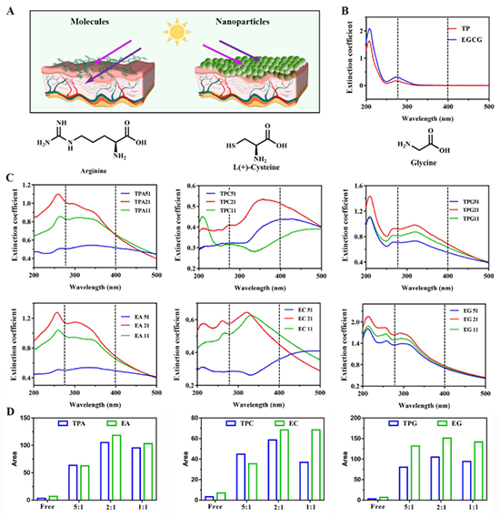 天然酚類化合物是人體重要的膳食補充劑,不僅具有優異的抗氧化、抗炎活性,且對紫外線具有一定的吸收能力。然而,天然防曬劑的紫外吸收一般較窄,抗紫外效果并不理想。高度縮聚的木質素和多巴胺表現出更優異的紫外屏蔽作用,然而聚合多酚一般呈現深色到黑色,這阻礙了這些天然基紫外吸收劑作為防曬霜的實際應用。因此,如何擴展天然多酚的紫外光吸收范圍,實現色彩調控,并保留其活性對于開發天然多酚在日用品中的應用具有重要意義。