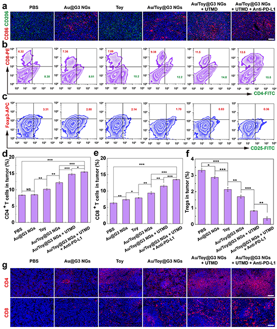 圖6.(a)小鼠腫瘤部位CD86和CD206染色結果;(b)小鼠腫瘤部位CD4+和CD8+T細胞的分布情況;(c)小鼠腫瘤部位Tregs的表達情況;(d-f)CD4+ T、CD8+ T細胞和Tregs細胞的表達水平;(g)脾臟CD4+和CD8+ T細胞的免疫熒光染色結果分析。