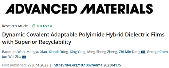 團隊認為確定適用的動態共價鍵、動態交聯網絡結構或離子聚合手段是能夠開發出完全閉環可重復利用聚酰亞胺的關鍵。對于剛性聚合物(如聚酰亞胺)的修復,由于修復條件的苛刻和復雜性,想要實際應用仍然面臨很多需要解決的關鍵問題;而對于可回收聚合物而言,材料損傷失效后被替換,隨后進行降解回收的后處理,條件相對易被調節,更有利于實際應用過程中的操控。本工作近期以“Dynamic Covalent Adaptable Polyimide Hybrid Dielectric Films with Superior Recyclability”為題發表于Advanced Materials(Doi: 10.1002/adma.202304175)上。第一作者為北京科技大學20級博士萬寶全,通訊作者為北京科技大學查俊偉教授和清華大學黨智敏教授