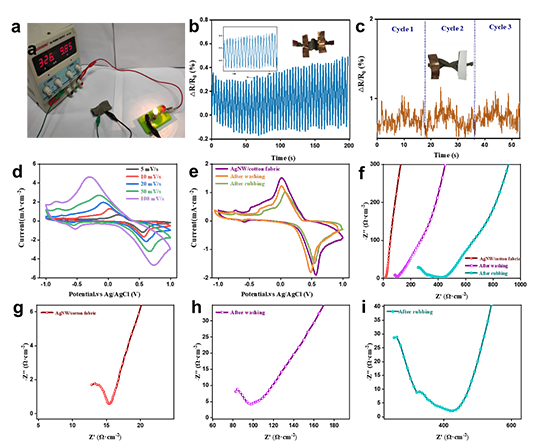 圖2. AgNW/棉織物的導電性及其電化學特性