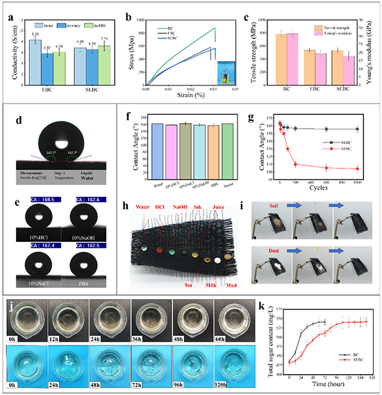 近日,華中科技大學生命科學與技術學院楊光教授團隊以細菌纖維素(BC)為基材,結合濕擰、生物制造以及納米摻雜等工藝方法,設計了一種具有新型超疏水導電纖維(SEBC fiber),并以此構建具有自清潔和抗污性能的可降解超疏水織物型納米摩擦發電機(SF-TENG)。相關研究內容以“Fabric-Based TENG Woven with Bio-fabricated Superhydrophobic Bacterial Cellulose Fiber for Energy Harvesting and Motion Detection”為題發表于國際權威期刊《Advanced Functional Materials》上,華中科技大學在讀博士生陳坤為第一作者。
