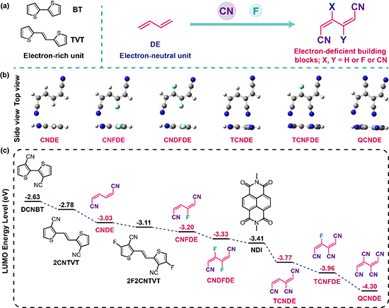 圖1. (a)氰基丁二烯類缺電子結構單元的設計策略,(b)該類缺電子結構單元及報道的氰基噻吩類結構單元的理論計算LUMO能級(基于自旋限制的密度泛函理論(DFT),在B3LYP/6-31G(d)方法和基組下計算)。
