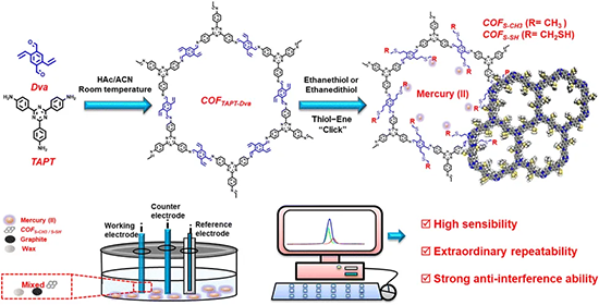在這項研究中,作者基于硬-軟-酸堿理論,設計制備了巰基和硫醚功能化的三嗪類共價有機骨架(COFS-CH3/COFS-SH),并將其作為與汞離子特異性結合的平臺材料。因此,當在碳糊電極(CPE)中使用COF作為改性劑時,COFS-CH3改性的CPE顯示出非凡的性能(檢測限為0.01 ppb; 線性范圍為0.1至1.0 ppb)和可重復性,用于微量汞的電化學檢測,甚至在從自來水或湖水中收集的真實的樣品中。這種創新的方法首次利用共價有機框架(COF)的固有性質,實現了對目標分析物的高度靈敏和選擇性檢測。