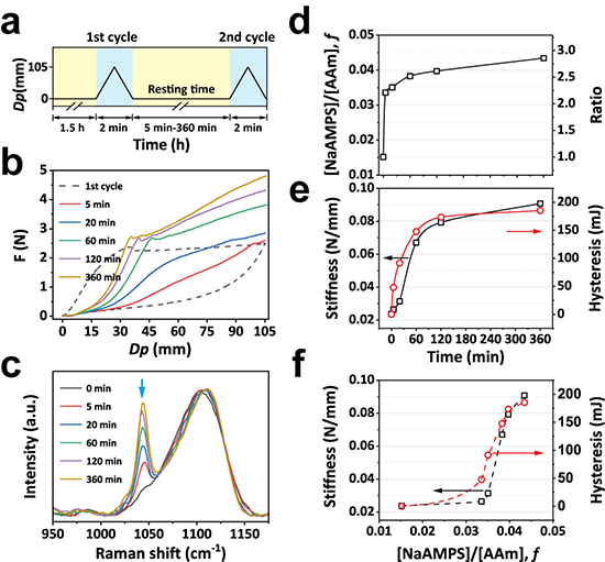 圖5 (a, b) 首次拉伸后,機械性能的增長 (c) 屬于新增聚合物的拉曼信號(藍色箭頭標示)在6小時內持續增強 (d,e) 化學和機械參數的生長-時間曲線 (f) 機械增長相對于化學增長的滯后性