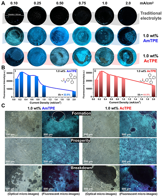 圖4 熒光示蹤劑用于考察不同電流密度對SEI膜的影響。