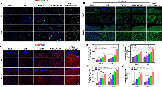 為了得到負載VEGF的復合水凝膠,將不同濃度的VEGF加入到水凝膠前提溶液中。以紫外光交聯的形式形成GelMA-CMCS1@VEGF。以HUVECs(人臍靜脈內皮細胞)作為實驗對象,將其注射入凝膠,在五天內評估細胞活力及增值情況,結果表明,CMCS1@VEGF水凝膠對血管內皮細胞的粘附和增殖比GelMA組和GelMA-CMCS1組水凝膠高。在小管形成測定和MTT細胞實驗后,均顯示GelMA-CMCS1@VEGF在生物安全性和促成血管方面具有顯著優勢。