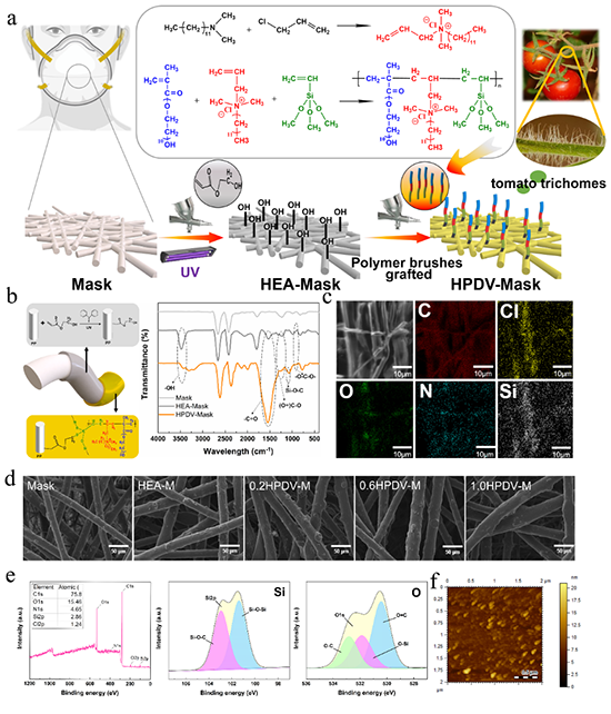 本研究受野生番茄毛狀體的啟發(fā),開(kāi)發(fā)了一種仿生策略來(lái)制備抗微生物口罩。該策略基于簡(jiǎn)單的噴涂工藝,將合成的聚合物刷PPEGMA-co-DADAC-co-VTMO)穩(wěn)定地接枝到口罩纖維上,并改變納米-宏觀性能,制備成HPDV口罩。與普通口罩相比,HPDV口罩具有較強(qiáng)的抗菌和抗病毒性能。此外,PPDV涂層可以很容易地應(yīng)用于各種常用口罩的表面,以提高對(duì)細(xì)菌氣溶膠和固體顆粒的過(guò)濾性能。重要的是,HPDV口罩非常耐用,使用壽命長(zhǎng)。這種簡(jiǎn)單、可持續(xù)的多功能涂層制造策略顯著提高了防護(hù)口罩的性能和應(yīng)用前景。這項(xiàng)研究的結(jié)果表明,HPDV口罩可以有效地防止細(xì)菌、細(xì)顆粒物和其他物質(zhì)的傳播,從而顯著減少呼吸道傳染病在人類(lèi)中的發(fā)生和傳播。