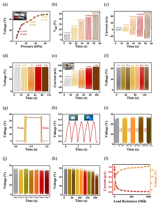 圖3展示了所提出傳感器的系列常規性能測試結果。包括:(a) 傳感器在0-60 kPa壓力范圍內的輸出電壓,以及在不同壓力點下對應的 (b) 輸出電壓波形和 (c) 電流波形。傳感器的 (d) 輸出電壓波形和 (e) 輸出電流波形與頻率的關系。(f) 傳感器的電壓響應與濕度的關系。(g) 傳感器的響應時間和恢復時間。(h) 傳感器的最小檢測極限。(i) 傳感器在四個小時周期性壓力下的輸出電壓脈沖。(j) 傳感器在七天內的輸出電壓脈沖。(k) 傳感器的電壓響應與溫度的關系。(l) 傳感器的輸出電流和電壓與外部負載電阻的關系。