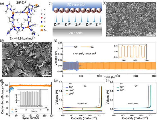 圖5. (a) ZIF和Zn2+的相互作用模型,(b) SZ膜影響鋅沉積的示意圖, 分別采用 (c) SZ隔膜和 (d) GF隔膜的鋅負極表面SEM圖,(e)對稱電池的循環性能,(f) 鋅/銅半電池的庫倫效率,(g, h) 相應的電壓曲線