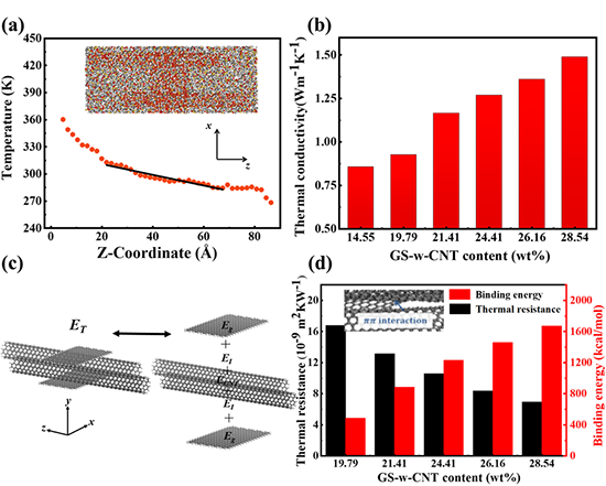 隨著微電子器件的高度集成和小型化,迫切需要先進的熱界面材料來更有效地解決運行中的熱管理問題。聚合物基材料因其優異的柔韌性、輕質、優異的加工性能和低成本而在高功率微電子器件的熱管理領域引起了廣泛的關注。具有高導熱性的填料增強的聚合物納米復合材料由于其優異的機械適應性、突出的加工性能和優異的柔韌性,在下一代電子器件的熱管理方面顯示出廣闊的前景。然而在低負載情況下保持復合材料柔性的同時實現高導熱率仍然是一個挑戰,一個主要原因是填料顆粒之間的界面熱阻嚴重阻礙了納米復合材料導熱率的進一步提高。本研究提出結構焊接策略來提升納米復合材料的熱導率,通過實驗加模擬研究復合材料內部微觀界面的熱傳輸行為。以碳納米管(CNT)網絡作為導熱填料,通過碳源浸漬和熱退火策略構建了由不同石墨結構(GS)焊接的CNT網絡(GS-w-CNT)。將其與聚二甲基硅氧烷納復合后,系統地研究GS與CNT界面焊接后對CNT納米復合材料熱導率的影響。同時進行分子動力學模擬,對界面焊接的GS與CNT網絡結構之間的界面熱阻,界面結合能以及聲子耦合進行了探究。