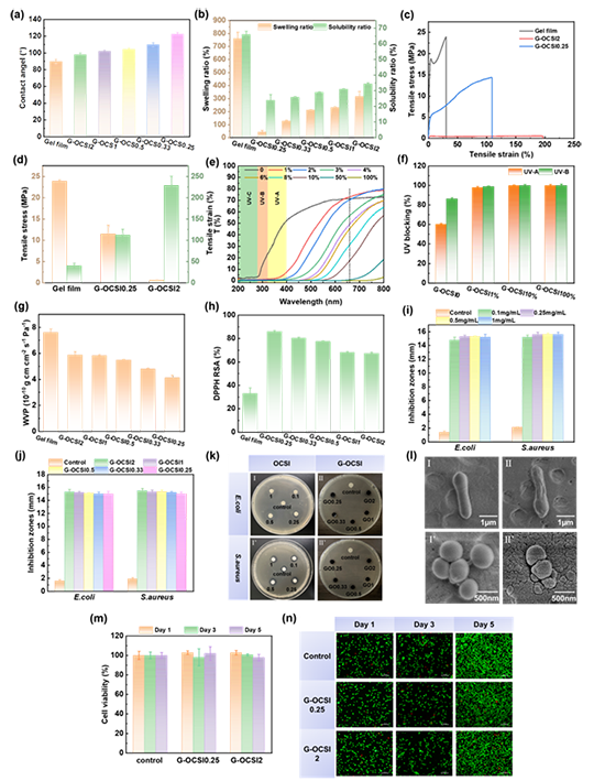 圖 3 Gel膜和 G-OCSI 的水接觸角(a),溶脹率和水溶率(b),拉伸性能(c-d)、紫外-可見光透射光譜(e),UV-A(320-400 nm)和UV-B(280-320 nm)阻隔性能(f),水蒸氣滲透性(g)和抗氧化性能(h);OCSI 的最低抑菌濃度(i),G-OCSI 的抑菌圈直徑(j),圓盤擴(kuò)散試驗(yàn)的培養(yǎng)皿圖像(k),其中,OCSI 的最低抑菌濃度(I和 I''),G-OCSI 的抗菌效果(II和 II''),DMF 用于對照實(shí)驗(yàn)。E.coli和S.aureus在Gel膜和G-OCSI上培育的SEM圖像(i);CHL細(xì)胞在G-OCSI浸提液中的細(xì)胞活性(m)和熒光顯微鏡圖像(n)。