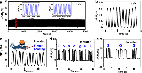 圖5. 水下通信。(a)SIGs 在20%拉伸應(yīng)變下進(jìn)行5000次加載/卸載循環(huán)的相對(duì)電阻變化;(b,c)在空氣中(b)和水下(c)手指進(jìn)行重復(fù)彎曲和伸直時(shí)SIGs的相對(duì)電阻變化;(d,e)SIGs通過(guò)摩斯密碼在水下發(fā)出“ionogel”(d)和“SOS”(e)信息