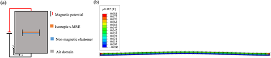 之后,利用已驗(yàn)證的力磁耦合單元,作者對由各向同性軟磁流變彈性體和非磁性彈性體組成的雙層梁的磁驅(qū)動動力學(xué)行為進(jìn)行了有限元模擬。通過有限元仿真模擬,旨在了解慣性和粘彈性行為對各向同性軟磁流變彈性體磁致變形的影響,揭示各向同性軟磁流變彈性體驅(qū)動結(jié)構(gòu)的非線性磁驅(qū)動行為和設(shè)計對應(yīng)的磁場控制策略,并確保各向同性軟磁流變彈性體驅(qū)動器的磁驅(qū)動行為按照預(yù)期進(jìn)行。