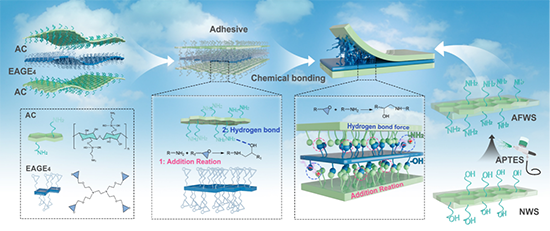 膠黏劑在生產和生活中扮演著極其重要的角色。由于膠黏劑和基材的種類多樣,膠接強度的形成往往是由多種界面作用力(化學、物理相互作用等)協同貢獻導致的。在木材膠合技術領域,機械膠接作用力被認為是主要因素,木材基材與膠黏劑界面之間的化學鍵合作用力被較少關注。然而在基材與膠黏劑二者界面之間定向設計并構建能交聯鍵合的化學膠合界面體系,是研究制備超強膠合界面材料的有效途徑之一。