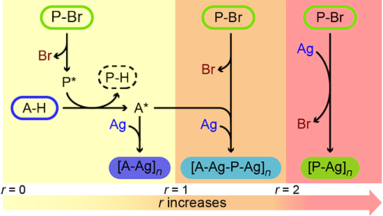 圖2. 不同化學計量比下P-Br與A-H的表面有機金屬聚合反應路徑示意圖。