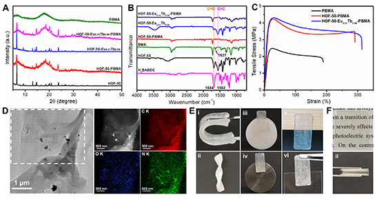 圖4. (A-C) HOF-50-Ln的XPS譜圖及(D) TEM圖;(E) HOF-50-Ln-PBMA的TEM圖