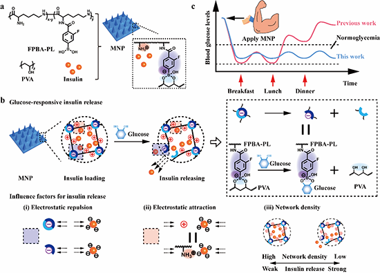 糖尿病是一種由于患者胰島素分泌功能缺失或受損而導致的以高血糖為主要特征的代謝性疾病。根據(jù)國際糖尿病聯(lián)合會的調查顯示,全世界糖尿病患者的人數(shù)已超過5.37億。目前對于I型和重癥II型糖尿病的治療需要每日注射2~4次胰島素以維持正常血糖水平,這給患者帶來注射的疼痛和生活不便,同時由于無法按需要實時給予合適劑量的胰島素,存在過量給藥的低血糖風險。葡萄糖響應微針貼可根據(jù)血糖水平自適應調節(jié)胰島素釋放速率,在糖尿病治療領域受到廣泛關注。