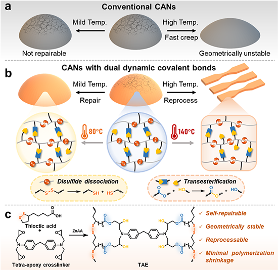 紅外透過材料由于長期暴露于惡劣的外部環境,很容易受到機械和腐蝕損壞。然而,傳統紅外透過材料不具備自修復能力,因此限制了其使用壽命。共價適應性網絡可逆去交聯和交換反應表現出自修復、再加工和回收利用的能力。然而,傳統共價適應性網絡中,由具有高鍵能的強動態共價鍵,如酯鍵、脲鍵和氨酯鍵等組成的材料,難以在溫和條件下進行自修復。而具有低鍵能的弱動態共價鍵如二硫鍵組成的材料通常在熱驅動自修復時會發生快速蠕變,這將改變紅外透過材料器件的精確尺寸,并因此不可避免地影響紅外成像的質量。因此,平衡共價適應性網絡的動態性能和抗蠕變性能仍然是一個挑戰。