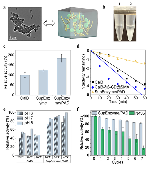 圖2. SupEnzyme及其聚集體(SupEnzyme/PAD)的催化活性。