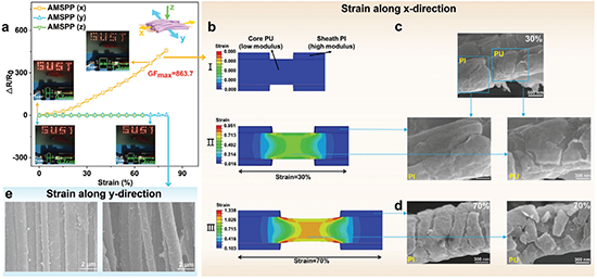 AMSPP應變子傳感器只響應沿x方向的面內應變,并在0-80%的應變范圍內具有863.7的最大靈敏度。AMSPP應變子傳感器的各向異性感應特性可歸因于定向結構所導致的不同應變方向下的不同導電網絡變形機制。當其受到的應變沿纖維軸向時,纖維上的MXene形成裂紋并逐步擴展,從而產生電響應;而當其受到的應變沿纖維徑向時,僅僅是纖維間產生滑移,從而幾乎沒有電響應。AMSPP應變子傳感器高的靈敏度和寬的傳感范圍可歸因于分段結構所導致的表面應變重分布。具體地說,AMSPP上的低模量PU表面有助于在拉伸過程中形成應變集中,從而通過MXene裂紋的快速形成和擴展來提高其靈敏度,而高模量PI表面的低應變分布則通過減緩MXene裂紋的形成和擴展來拓寬其傳感范圍。
