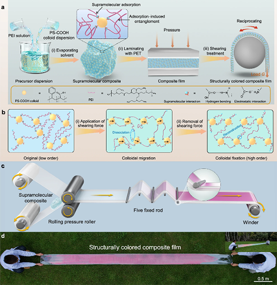 結構色復合膜可由膠體晶體陣列和聚合物復合而成,在柔性顯示、防偽材料、光學涂層、可視化傳感等領域具有廣泛應用。然而,目前高質量結構色復合膜的規模化制備仍存在挑戰。依靠溶劑揮發誘導膠體有序組裝的方法受到熱力學和動力學的多因素控制,不易調控、過程耗時。