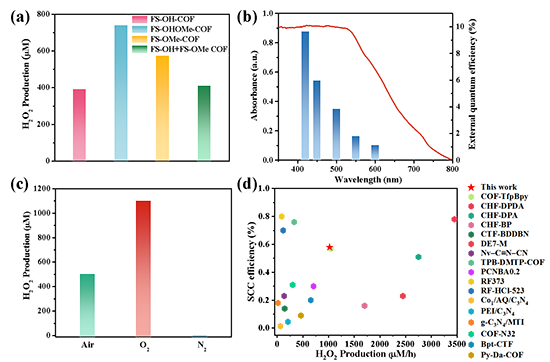 過氧化氫是一種高效且環境友好的氧化劑。利用太陽光、水和氧氣生成過氧化氫,被認為是生產這種化學品的最有前途的可持續方式之一。在這方面,共價有機框架(COFs)材料通過動態共價鍵連接,具有精準控制孔隙大小和靈活修飾骨架的能力,成為了有潛力的晶態有機光催化劑。因此,研發能夠高效光催化生產過氧化氫的COFs材料對該領域的進展至關重要。