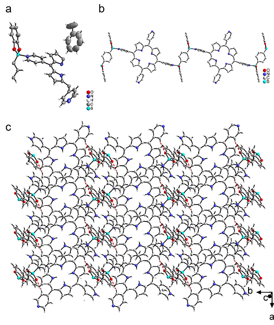 另一方面,CityU-16的SCXRD測量表明,它同樣是空間群為P-1的三斜晶體結構,具有由半個BACT、半個TPYP和一個甲苯分子組成的不對稱單元(圖3a)。CityU-16具有與CityU-15類似的鏈狀結構:每個BACT通過B─N相互作用連接兩個TPYP單元,形成之字形鏈。類似地,CityU-16可被視作具有空隙的偽3D超分子結構,而這些空隙的存在使得甲苯分子進入晶體中。BACT和吡啶之間的氫鍵相互作用穩定了晶體結構。
