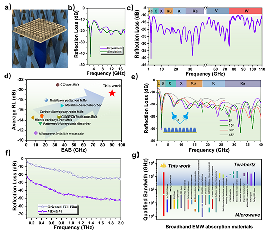 作者展示了一種由周期性石墨烯氣凝膠單元和柔性定向羰基鐵薄膜組成的新型磁-介電協同超材料。采用定向冷凍干燥法制備了垂直定向結構的石墨烯氣凝膠,采用刮涂技術制備了水平定向的大規模定向羰基鐵薄膜。通過仿真和實驗驗證了磁-介電協同超材料的寬帶吸收性能取決于石墨烯氣凝膠單元的幾何形狀和磁膜的磁損失容量。與以往的寬帶電磁波吸收材料相比,新型磁-介電協同超材料提供了增強的多光譜超寬帶電磁波吸收性能,其有效吸收頻段可以覆蓋1 - 40, 50-110 GHz和0.1-2 THz。整個測試頻率的平均反射損耗高達-19.3 dB (電磁波被吸收98.8%)。此外,當天線的入射角從5°增加到45°時,磁-介電協同超材料保持了良好的寬帶吸收性能。