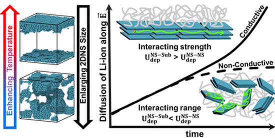 與傳統的降溫結晶有序過程不同,本文觀察到在高溫條件下,二維納米片呈現出有序自組裝的結構。這一現象可以解釋為隨著溫度的升高,高分子鏈的構象熵也隨之急劇增加。同時,二維納米片界面的存在嚴重阻礙了鏈構象的伸展,從而影響了高分子鏈構象熵的增加。這導致高分子鏈傾向于將二維納米片驅動聚集在一起,形成最優堆疊,以盡可能減少界面的存在。從尺寸-溫度結構相圖中,觀察到在高分子中二維納米片的聚集結構具有非單調性。有序結構似乎僅僅出現于特定條件,不僅受溫度的控制,而且與尺寸有關。進一步,通過分析二維片在體系內部和體系邊界的聚集動力學模式,并分別計算了兩種聚集模式下的熵驅動勢能,解析了非單調相行為背后的熵驅動機制。通過抽樣觀察,從微觀層面觀察到了二維納米片在不同位置聚集動力學模式的差異。最后,測試了本文有序結構的離子導電性。相比于無序二維片結構,有序二維納米片形成的層狀傳輸通路極大的提高了離子的傳輸效率,為離子長距離傳輸提供了通道。因此,離子在有序結構中的傳輸表現出長距離、速度快等特點。