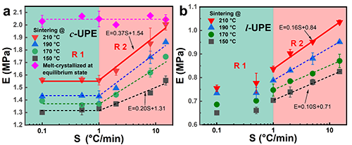 針對上述問題,鄭州大學陳靜波教授課題組通過控制初生商用超高分子量聚乙烯(c-UPE)和低纏結超高分子量聚乙烯(l-UPE)在燒結過程中的加熱速率(S)和溫度(T),實現熔融過程的控制,使得熔體具有不同程度的纏結。同時,研究了熔融行為與鏈纏結之間的關系,以及熔融過程中纏結的變化機制。利用超高分子量聚乙烯(UHMWPE)在熔點以上仍保持高彈態,力學性能完全依賴于纏結網絡的特性,采用了熔點以上拉伸實驗的彈性模量來表征鏈纏結度。結果顯示,實驗成功制備了纏結度較低的制品,并且實現了制品纏結度的較大范圍調控。