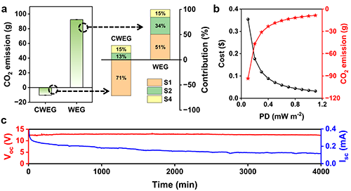 全生命周期計算表明:在產(chǎn)生1 W s的電能時,CWEG的CO2排放約為-10.4 g (圖2a)。由此可見,CWEG可實現(xiàn)“負(fù)碳發(fā)電”。除藍(lán)藻外,其他微藻,包括硅藻和小球藻也可以用來制備CWEG,并取得了良好的發(fā)電性能。值得注意的是,當(dāng)CWEG的功率密度從1.1 mW m?2降低到0.1 mW m?2時,CWEG的CO2排放量從?93.4 g變化到?8.5 g (圖2b)。該結(jié)果表明,CWEG的功率密度越低,負(fù)碳效益越好。然而,在相同的輸出性能下,CWEG的功率密度越低,發(fā)電成本越高。因此,平衡CWEG的CO2排放量和成本也較為重要。
