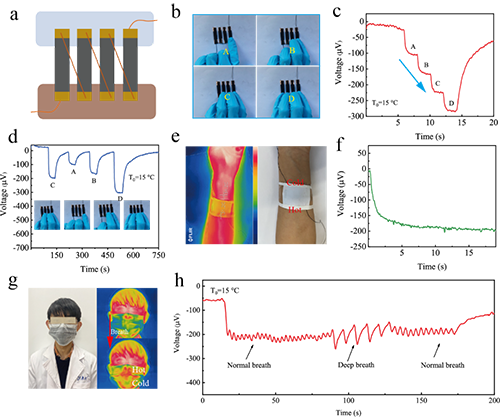 圖4 MXene熱電織物的熱電傳感陣列原理圖、觸覺響應和呼吸監測應用