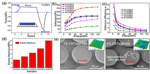 近期,中北大學祝錫晶教授團隊聯合西安交通大學邵金友教授/田洪淼教授團隊提出了一種新型的氟橡膠&納米填料基仿生干粘附結構,該干粘附結構通過仿生雄性金邊龍虱跗節處的吸附墊,在接觸末端引入了陣列的“吸盤狀”微結構。由于氟橡膠與碳納米管填料固有的耐高溫特性及“吸盤狀”末端結構設計,該干粘附結構在室溫至大于200℃的寬溫度區間內均可展現出高于常規聚合物基仿生干粘附結構的粘附強度(>350 kPa)及粘附效率(可達77.7)。更重要的是,該干粘附結構在高溫環境下可實現無痕粘附,不會對目標表面造成污染,這是常規聚合物基仿生干粘附結構所無法達到的。此外,還可通過調節納米填料的含量來精確調控結構的整體等效模量,從而實現粘附強度的進一步增強,相應的有限元仿真也驗證了這一調控機制。最后,干粘附結構被用作抓手的接觸表面進行了應用展示,其可在室溫及高于200℃的環境下對諸如玻璃基板及硅晶圓等精密易碎物料實現可靠無痕抓取,展現了巨大的應用潛力。