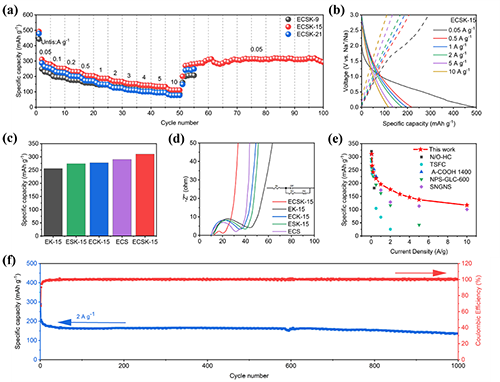 圖 4 不同用量的硝酸鉀(ECSK-x(x=9,15 和 21)的 (a) 電流密度為 0.05 A g-1至10 A g-1時的速率性能。(b) 電流密度為 0.05-10 A g-1 時的首圈恒電流充放電曲線。EK-15、ECK-15、ESK-15、ECS 和 ECSK-15 的 (c) 不同前驅(qū)體成分對碳材料比容量的影響。(d) EIS 曲線。(e) 與之前報告的典型陽極的速率性能比較。(f) ECSK-15 在電流密度為 2 A g-1 時的循環(huán)性能。